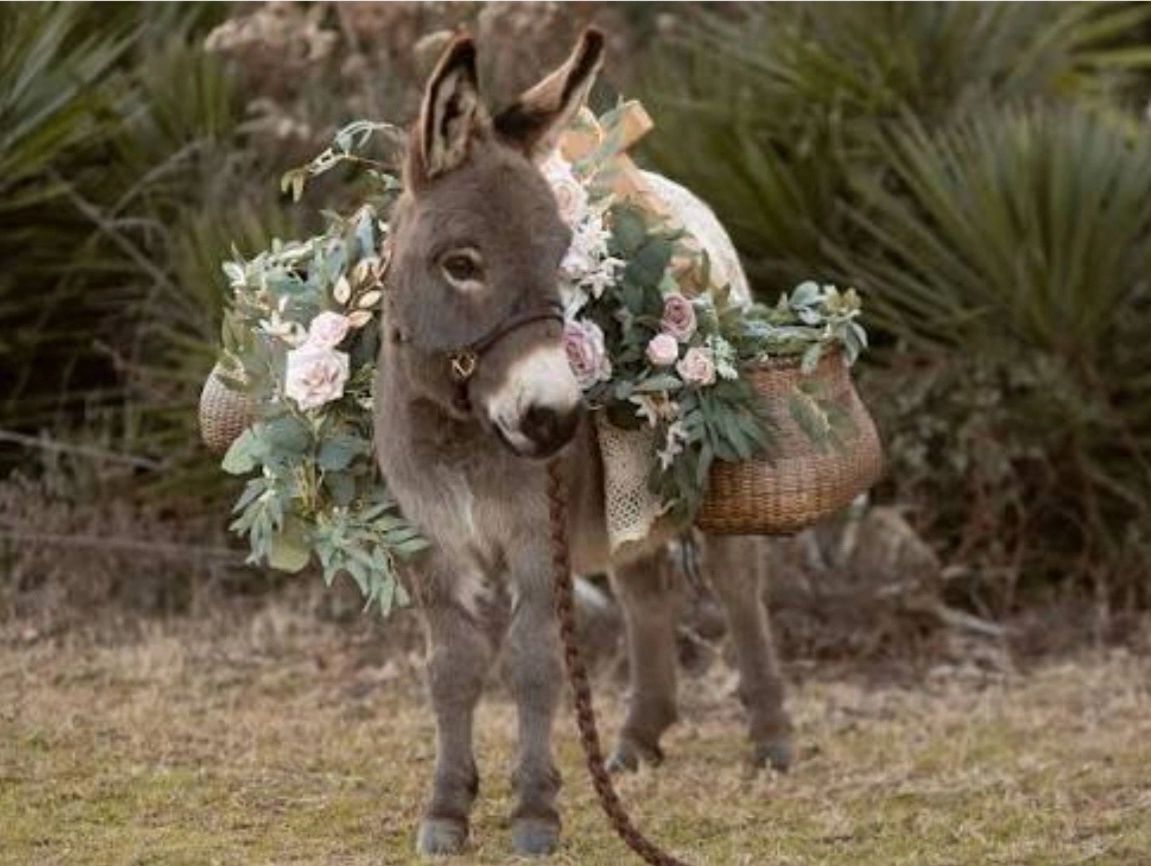 βBurro and Pint Pony dressed with flowers, hats, or accessories.